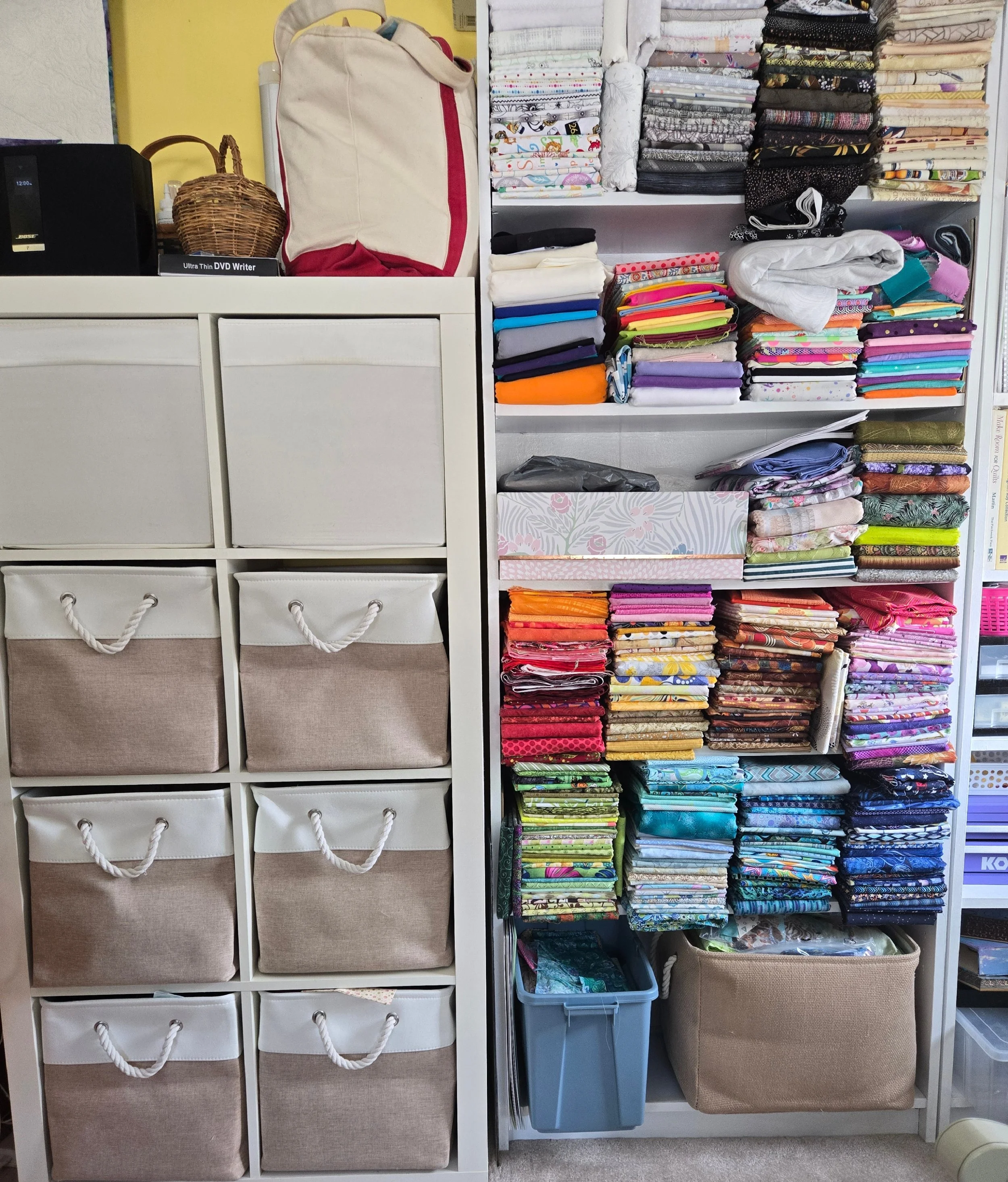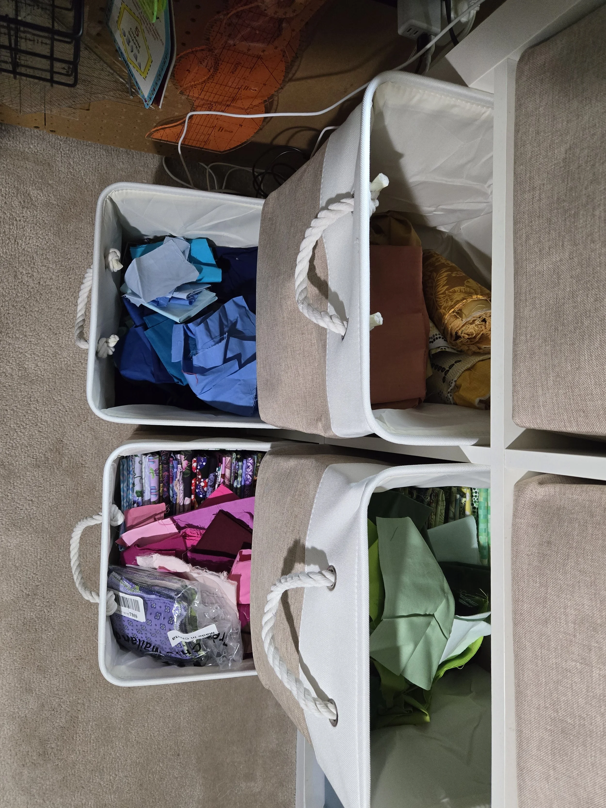In the photo above, the cube unit on the left hand side is the solution. It will ultimately by turned over (landscape style) and will have my ironing station on top of it. I took all the different chopped cut sizes and simply combined them into a single bin by color. It’s actually very liberating to have everything in one spot, and not have to look for something in more than 1 place. I do need to make a tag system so I tell what’s what by looking at them.