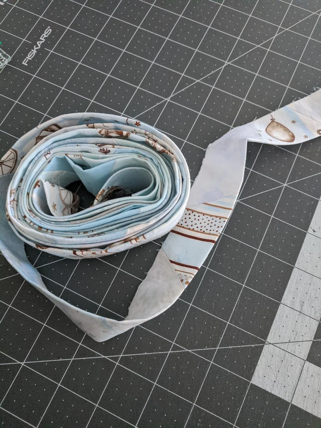 And remember I said I worked in those scraps from the original fabric pull? Yes, I did - I turned them into the scrappy binding for this piece. There’s a lot of bias in that strip, but for a binding, it worked.