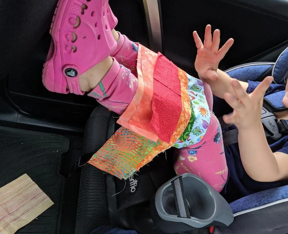 LQ has also been to an open sew meeting with my quilt guild back when we could meet in person. I was dropping off a quilt for the show, and she came with me. At 3, walking into a group of people who you don’t know can be intimidating, and she was a tad bit shy on this trip at the beginning. . It’s customary when you come into the group to walk around greet everyone, and ask about what they were working on. Shy left the building once she saw what people were working on, and she had a genuine interest in colors - she loves bolds and brights. At many of the tables, she was offered a small scrap for her stash at home, and she amassed quite a collection before we left. Waving, and saying good bye to the group on the way out…the scene in the photo above was going on in the back seat before we left the parking lot. She figured out a way to look at the colors and stay safe in the carseat.