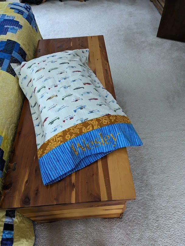 I have made pillowcases for my two oldest grandchildren, each designed around a theme and each with their name on the cuff of the case. Wes’ is 3 ½ years old, and he’s the grand that we’ve been seeing a lot of recently. He is (and always has been) all about airplanes, and he likes nothing better than to go to our small airport and watch the planes. It’s a great way to keep him entertained – and I’ve learned a lot watching him watch the planes take off and land.