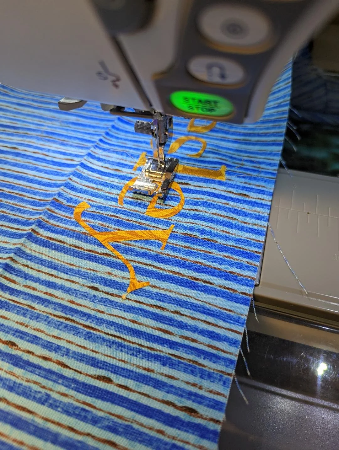 I found this fabric (which is from Robert Kaufman) on a destash site, and I knew that it was the starting point for his case. It’s got a beautiful feel to it – very soft – and the colors provide a lot of options for coordinating fabric with it. Since Wes’ favorite color is blue…that choice was easy. The brown was a scrap big enough to use for the flange and the letters.