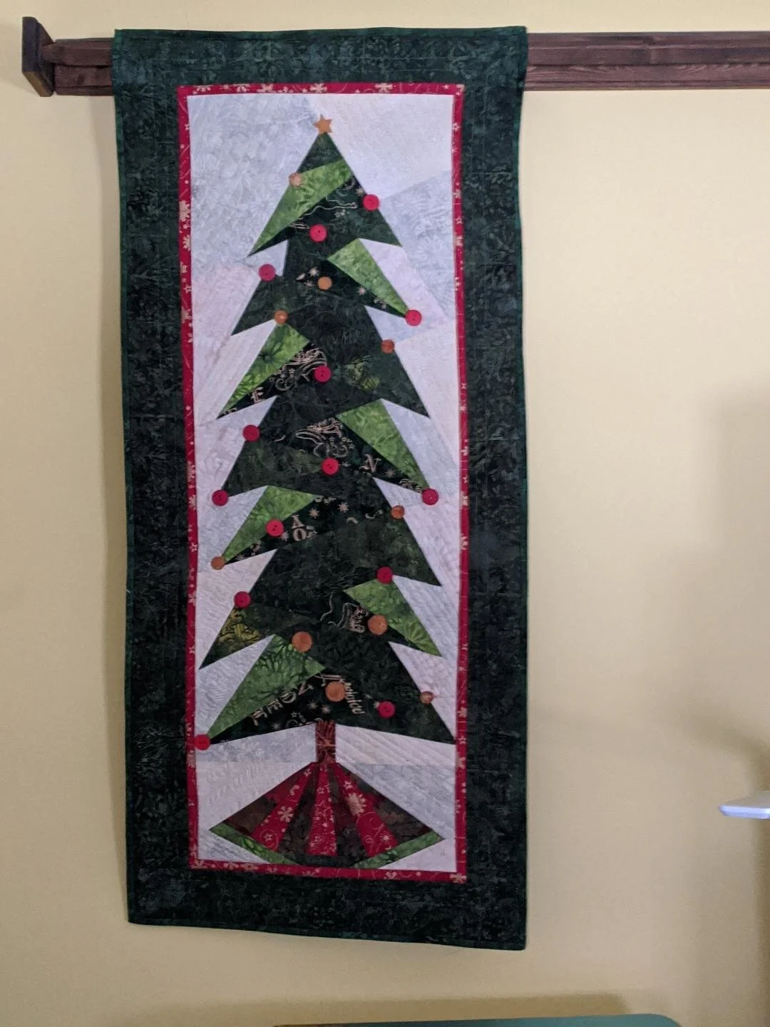 This is the “A Little Bit Shorter Tall Tree” by Cindi Edgerton, and this project dates back to when I was an Island Batik Ambassador - that’s their gorgeous Christmas fabric that is featured in it. I would love to take another crack at this pattern another time - maybe instead of working with traditional colors such as Red and Green, try some alternative colors for Christmas - flamingo pink, turquoise and lime green maybe. Can you tell I am glad to have this one off the list?