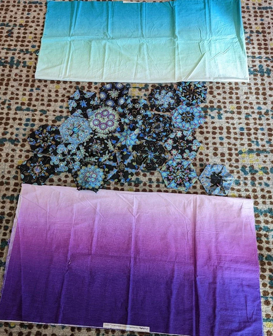 I also have in the project bin several yards of color gradation fabrics in both purple and teal - which will give Cheryl plenty of negative space on which to play. The final design has a teal band going across the top, a band of One Block Wonder (Kaleidoscope blocks) going across the center, and a band of the purple gradation on the bottome. It’s going up on the design wall sometime this weekend for playtime, but in the meantime…I had to take a deep breath and figure out how to cut the fabric before I left.