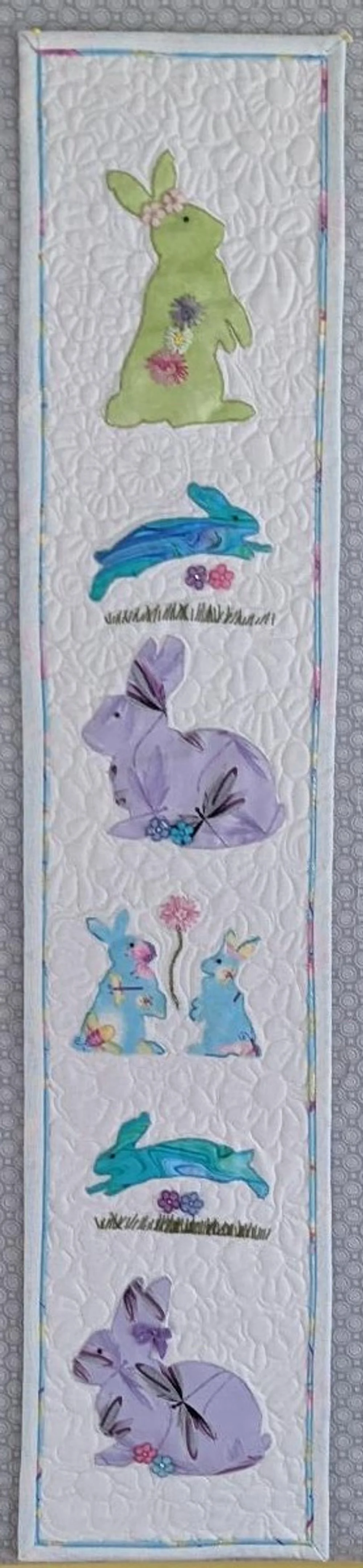 Now that I had a palette and a theme, I went to work. I didn’t use a pieced block on this project, but rather I went looking for a file that I could use with my Cricut maker to cut the bunnies. The file I had allowed me to use various sizes and shapes -because you know the bunnies never stand still for long, and they give it a whimsical feel. It also allowed me the flexibility to resize and flip the images to enhance the feeling that they never stand still for long. I took the bunnies with me on retreat in March, and worked on them while I was there. Once they were stitched down, I pulled out beautiful hand dyed threads (perle 8) that I have from House of Embroidery, and began to play. A few flowers, some grass…and more flowers added more personality to the piece.