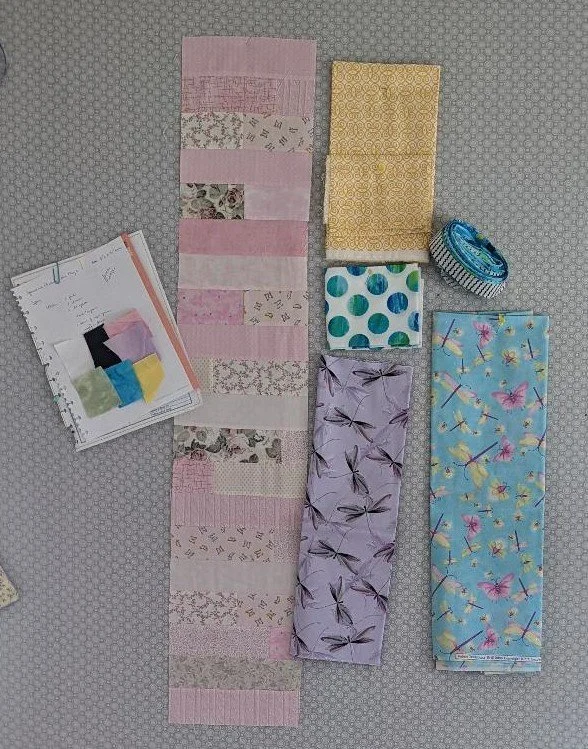This Challenge was called the Four Season Mural Challenge, and the impact of the quilts was to have them displayed en masse as a singular installation…which meant that one of the first challenges I had to overcome was size. Each of the individual quilts was supposed to be 8 ½” wide and 40 ½” long. The second challenge was color…each member was free to make as many entries as they wanted, but if you did only one, you were encouraged to use your birth season as your color key. I’m Spring – so that meant my palette was pink, lavender, light yellow, teal/turquoise, a touch of light green, and white and black. My first step in the process was a fabric pull, so I could get an idea of the colors.