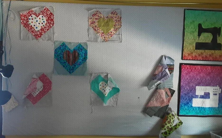 In this series, I’ll be working with a design element I love - but in 3 new ways. My machine binding technique for a Flange binding technique is very popular, and here, I’ll be working out variations of that same technique - called the Scrappy Flange. In the picture above, I raided my jelly bin for strips that I can use in my flange…all strips/scraps which are in the same tone as the central heart. I’m using this photo as a way to pick the best thread to use for the flange… I see lots of yellow undertones in this. Watch this space for more photos of this stash quilt in process.