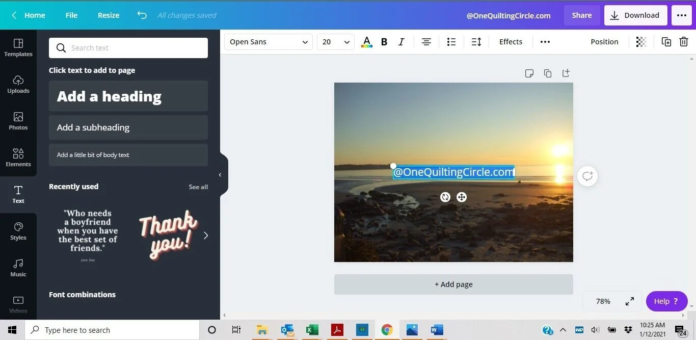 Begin typing the text you want to use in the watermark. In this case, I’m going with a simple @OneQuiltingCircle.com, which is the name of my website