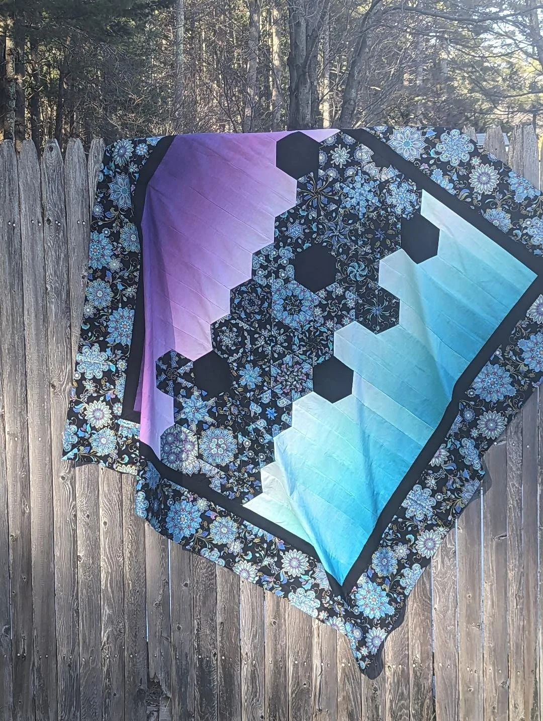 If you’ve been around this blog for a while - thank you if you have! - you will recognize the fence, if not the photo. I call this Flinging the Flimsy over my neighbor’s fence, and it tells my longarm quilter that the quilt is on its’ way to her to make it look magic. This is Lilacs and Seaglass (before Cheryl Szynkowski adds her magic touch to it). Below is that the finished quilt looks like after it’s return, before it’s sent to Houston to the MD Anderson Ovarian Cancer Auction.