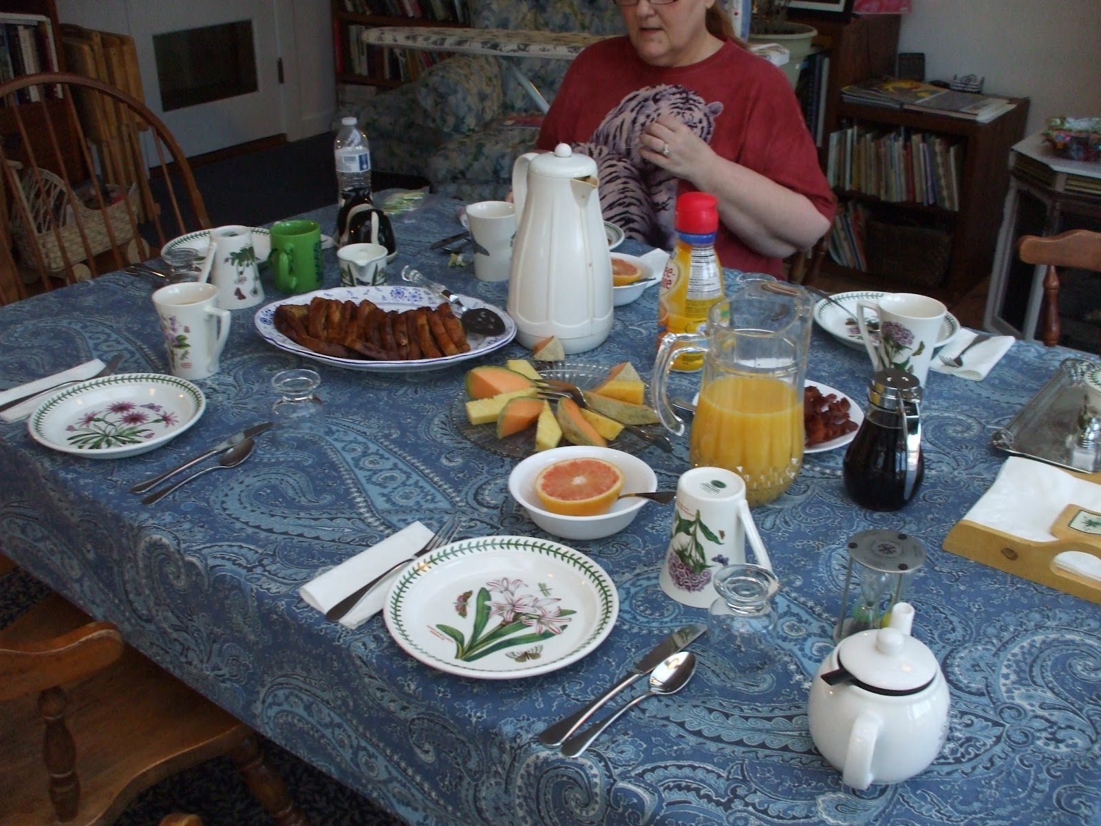 Well, I'm back and in one piece, having survived the second of two retreats. Well, I actually more than survived...I had a lot of fun, and got a lot of work done in the process. We were treated like Princesses for breakfast every morning - Does it get better than that? This retreat had a completely different feel than the last one did - this was far more relaxing and enjoyable for me - even when you consider that I was 'teaching' at this one. All of the ladies who came on the retreat are experienced quilters, so I'm not sure how much 'teaching' was needed, but I did manage to pull a few surprises out. We made fabric bowls out of spare fabric and thread snippets as souvenirs. We even managed to leave one behind with our wonderful Innkeeper as a thank you gift.